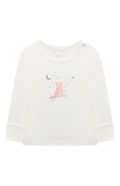 Комплект сшит из гипоаллергенного органического хлопка с принтами в виде животных и птиц. Брюки с эластичным поясом дополнены лонгсливом с к руглым вырезом и плоскими кнопками вдоль плечевого шва.