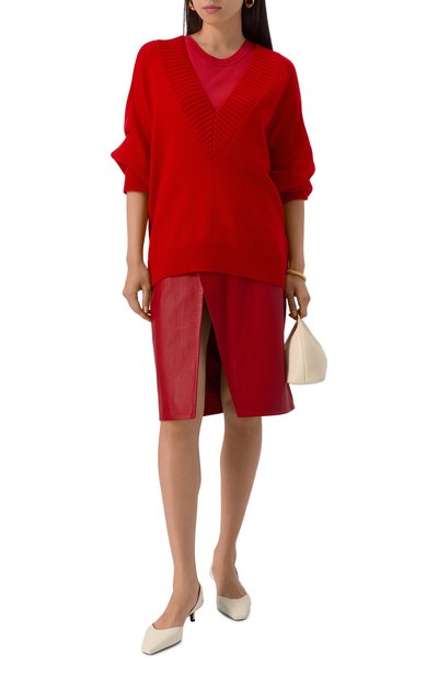 Юбку-карандаш изготовили из выделанной вручную мелкозернистой кожи с легким блеском. Модель с классической посадкой дополнена четырьмя карманами, высокой шлицей и застежкой спереди.