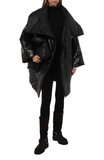 Свободную куртку Thaw сшили из глянцевого водоотталкивающего текстиля, сочетающего нейлон и полиэстер. Модель со спущенной линией плеч и матовым подкладом, видимым на широком воротнике, застегивается потайными пуговицами.