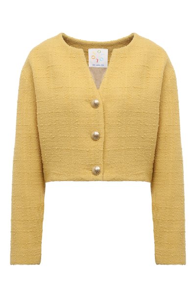 Укороченный жакет с фигурным вырезом и спущенной линией плеч сшили из фактурного шерстяного твида, усиленного полиамидом. Роль главного акцента отдали крупным золотистым пуговицам с рельефным орнаментом.