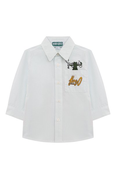 Полосатую рубашку декорировали изображением зверей, частично скрытым накладным карманом с логотипом. Модель с манжетами на пуговицах сшили из хлопковой ткани, хорошо пропускающей воздух.