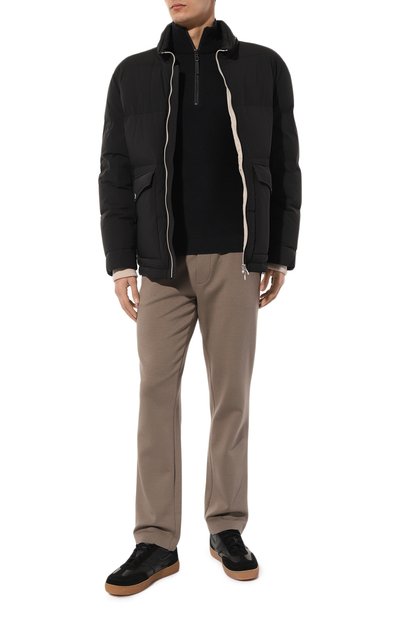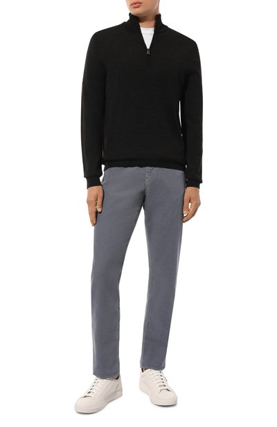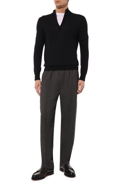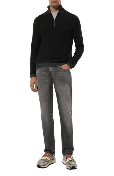Джемпер Derek в рубчик связали из шерстяной пряжи с добавлением кашемира. Кожаный пуллер короткой молнии на высоком вороте и прорезиненный ярлык над поясом сбоку украсили логотипами марки.