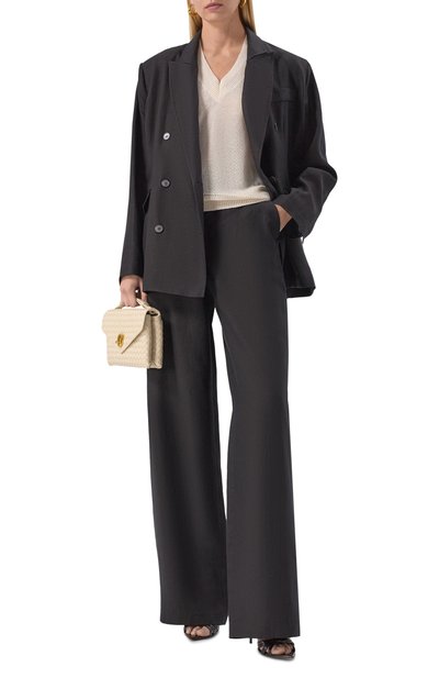 Двубортный жакет с широкими атласными лацканами и пуговицами дополнили одним прорезным карманом и еще двумя с клапанами. Благодаря мягкой вискозной подкладке модель из шерстяного габардина с добавлением полиэстера комфортно носить и с блузой, и на голое тело.
