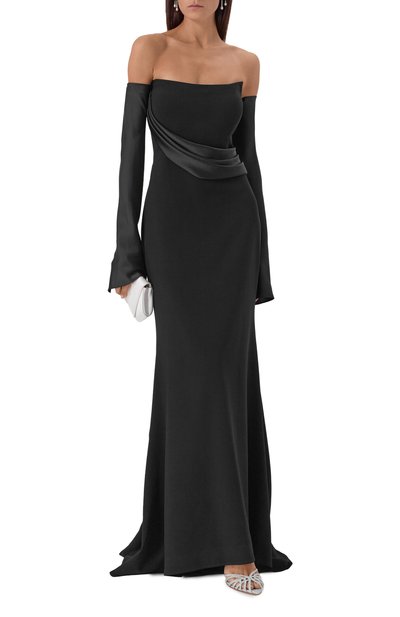 Глубокое декольте миди-платья декорировали вставкой из полупрозрачной сетки и бархатной аппликацией в виде цветка. Приталенная модель из вискозного джерси застегивается потайной молнией на задней стороне с высокой шлицей.