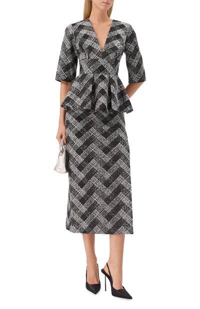 Костюм сшит из пластичной замши. Жилет с круглым вырезом и миди-юбка с накладными карманами застегиваются на фигурные пуговицы. Изделие удачно рифмуется с сумкой в тон и золотистыми босоножками.