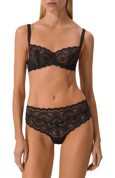 Трусы Intrigue сшили из полупрозрачного стрейчевого тюля. По бокам и сзади модель с хлопковой ластовицей украсили цветочной вышивкой и фестончатым кантом.