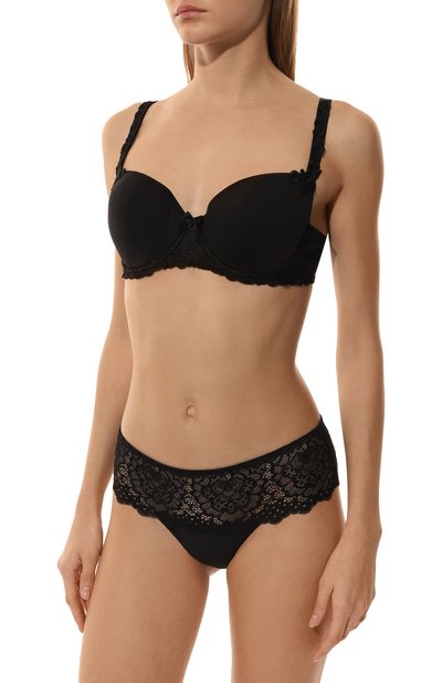 Трусы из коллекции Intrigue выполнили из смесового эластичного тюля и дополнили хлопковой ластовицей. По бокам и сзади белье украсили цветочной вышивкой, подчеркнув края фестонами.
