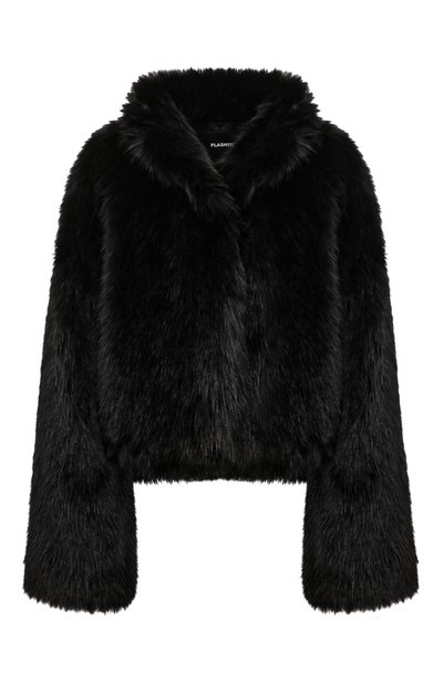 Короткую шубу с расклешенными рукавами и шалевым воротником сшили из экомеха с длинным блестящим ворсом. Модель дополнили потайной застежкой.
