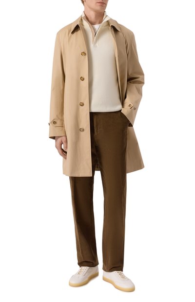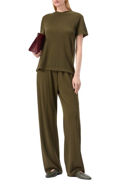 Свободные брюки со средней посадкой выполнены из тонкой шерсти мериноса. Боковые разрезы и два накладных кармана отделаны кантом в тон.