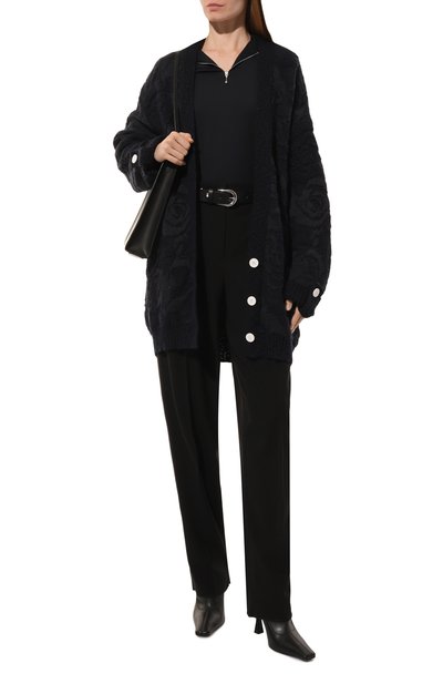 Кардиган с V-образным вырезом дополнили четырьмя накладными карманами. Модель с манжетами и поясом в резинку украшена узорами-эмблемами бренда, которым вторит гравировка на металлических пуговицах.
