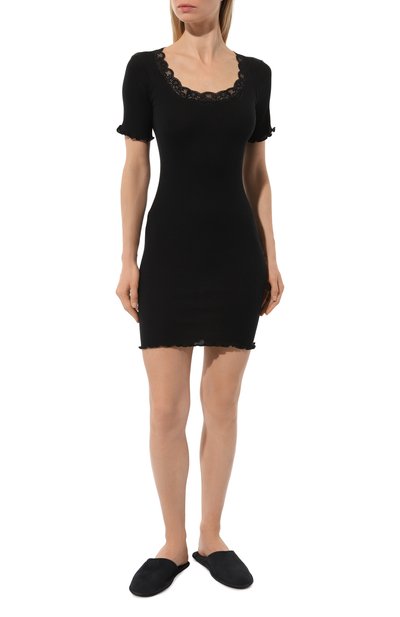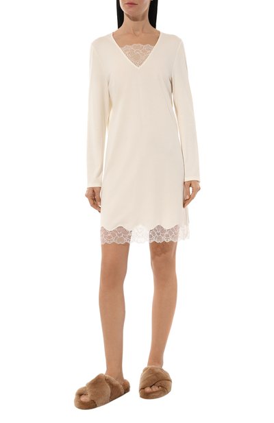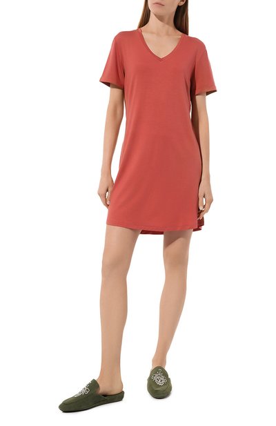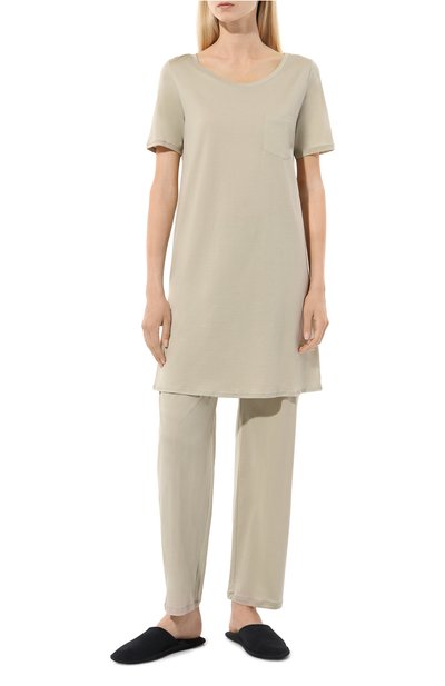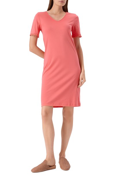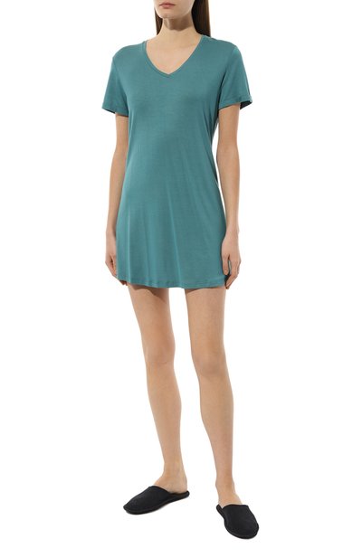 Свободная однотонная сорочка из линии Virginia сшита из интерлока на основе хлопка и модала. Манжеты коротких рукавов и кант на вырезе выполнили из шелкового атласа.