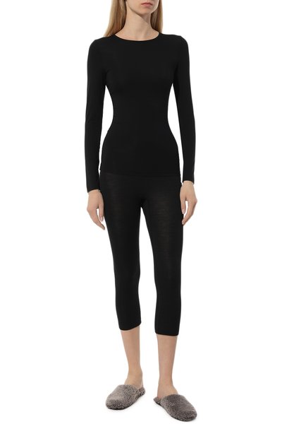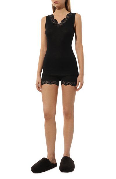 Топ из линии Woolen Lace сшит из тонкого трикотажа на основе шерсти мериноса и шелка. V-образный вырез отделан фестончатым кружевом в тон. Облегающую модель можно использовать в качестве термобелья.