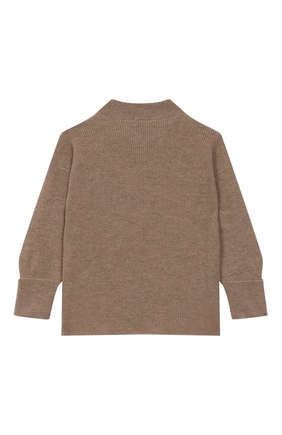 Для изготовления свитера с рифлеными высоким воротом, манжетами и поясом использовали тонкую пряжу из органического хлопка и шерсти. Модель украсили спереди цветочной вышивкой и золотистым логотипом марки.