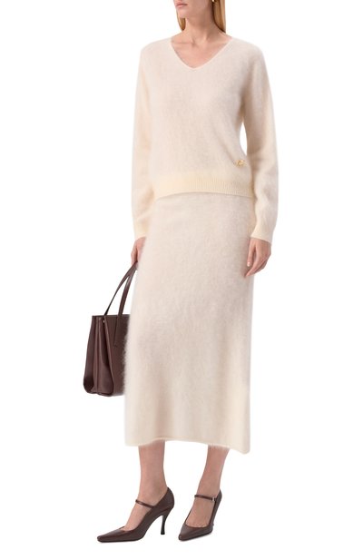 Макси-юбка с широким эластичным поясом и высокой посадкой выполнена из тонкой кашемировой пряжи. Модель, облегающая бедра, органично впишется в образ с водолазкой и ботфортами.