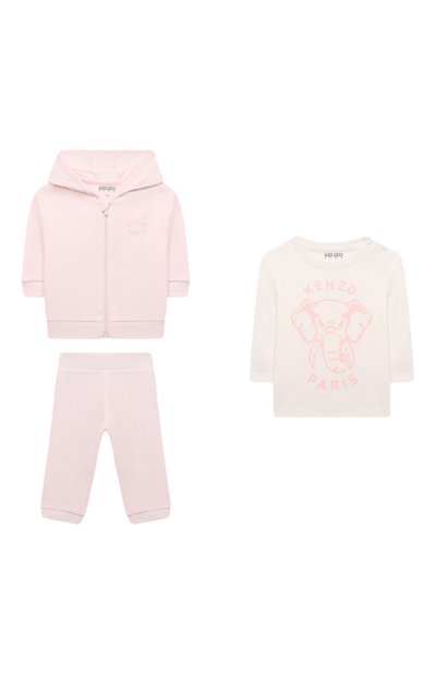 В комплект вошли джоггеры с эластичными манжетами и поясом, толстовка на молнии с защитой от защемления и лонгслив с плоскими кнопками на плече. Все изделия выполнили из хлопкового трикотажа.