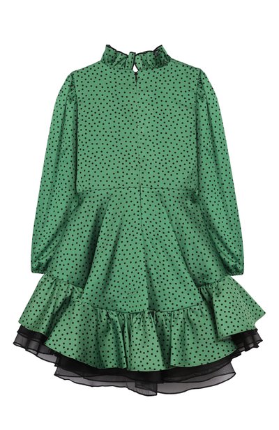 Платье с расклешенными манжетами и асимметричной баской, частично скрывающей подол, сшили из ламинированного полиэстера. Модель с драпировкой на лифе застегивается потайной молнией сзади.
