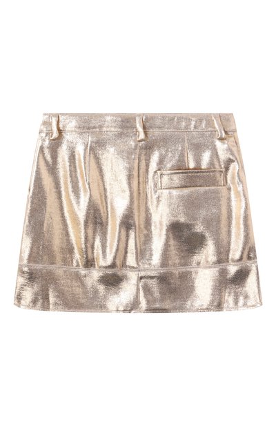 Для создания расклешенной юбки с оборкой использовали металлизированную ткань с восковым покрытием. За комфортную посадку на талии отвечает эластичная вставка на поясе.