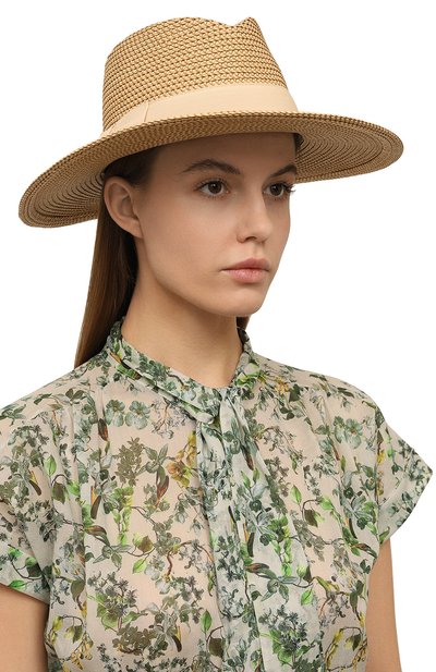 Шляпу Fedora изготовили вручную из мягкого фетра на основе пуха кролика. Широкополый аксессуар украсили лентой, на которой разместили металлическую пряжку — символ бренда.