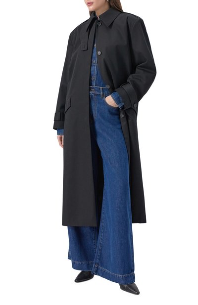 Плащ с рукавами реглан, двумя врезными карманами и съемным капюшоном сшит из гладкого полиэстера. Модель прямого кроя и высокая шлица застегиваются кнопками.