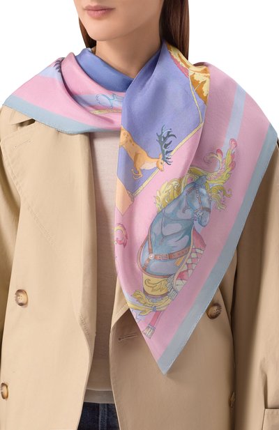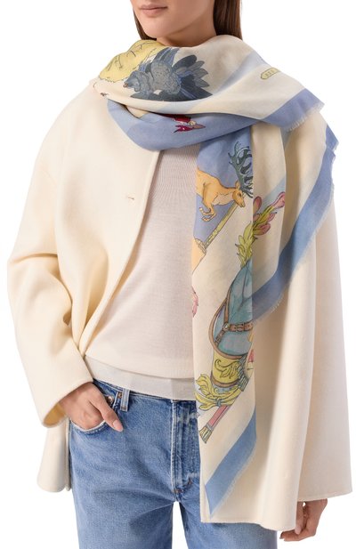 Принт на шелковой шали «12 Колен Израилевых» создан по мотивам мозаик одной из синагог Иерусалима. Рисунки обрамили растительным орнаментом, вписав в него звезду Давида.