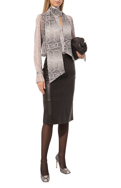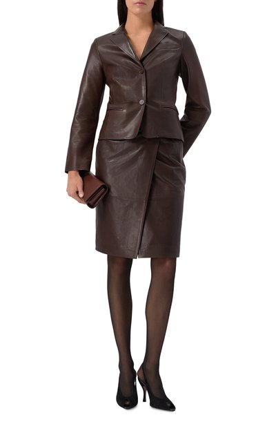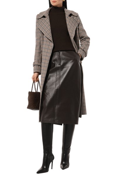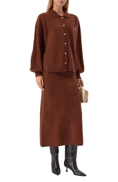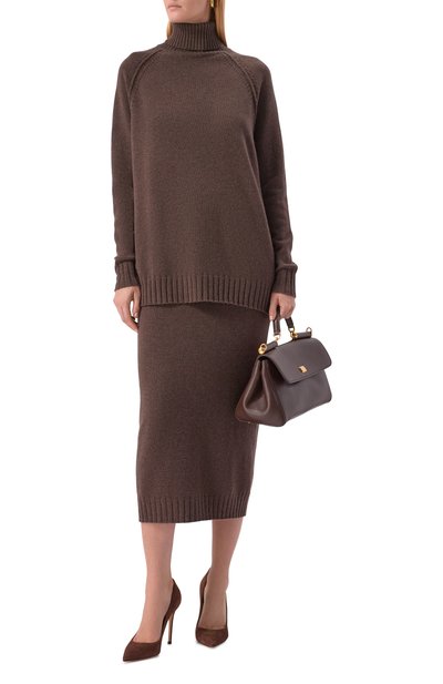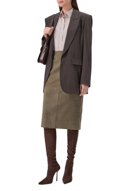 Для пошива миди-юбки использовали мягкую пластичную замшу. Модель с широким поясом на резинке удачно впишется в повседневный образ в светлых тонах или станет акцентом в наряде с черными вещами.
