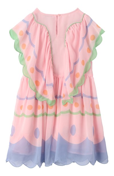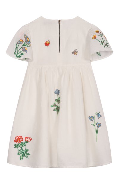 Платье с короткими рукавами-крылышками выполнили из тюля с вышитым паттерном в виде сердец. Модель с широкой оборкой снизу застегивается на пуговицу сзади.