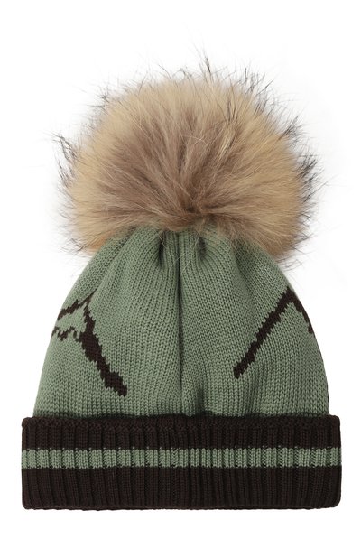 Шапку бини связали из полушерстяной пряжи с добавлением хлопка. Аксессуар с помпоном продублировали слоем легкого полиэстерового тюля с напоминающей перья бахромой.