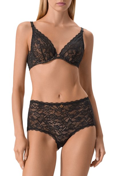 В коллекцию Danse Des Sens вошел бюстгальтер с треугольными чашечками на косточках. Модель с регулируемыми бретелями и бантом на перемычке выполнили из стрейчевого нейлонового кружева с цветочным мотивом и фестончатым кантом.