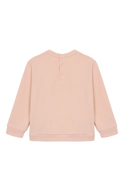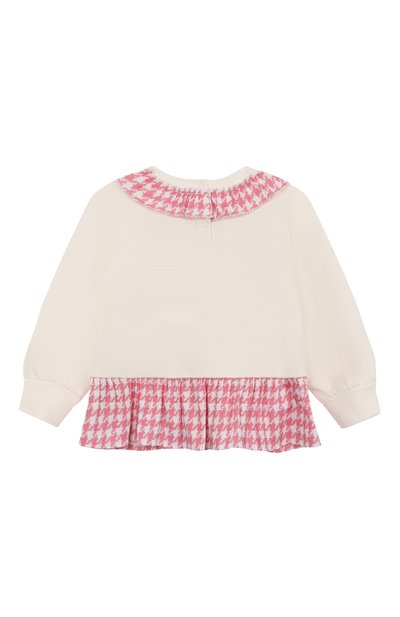 Свитшот с кнопками сзади сшили из хлопкового трикотажа стрейч. Спереди модель украсили логотипом марки и крупным изображением медведя с сердцем, декорированным стразами. Низ с боковыми разрезами подчеркнули оборкой в клетку тартан.