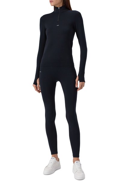 Облегающий пуловер с рукавами реглан выполнили из эластичного трикотажа Wool-Tech на основе мериносовой шерсти первого пострига и переработанного полиэстера. Модель с воротником-стойкой на молнии декорировали логотипом спереди.