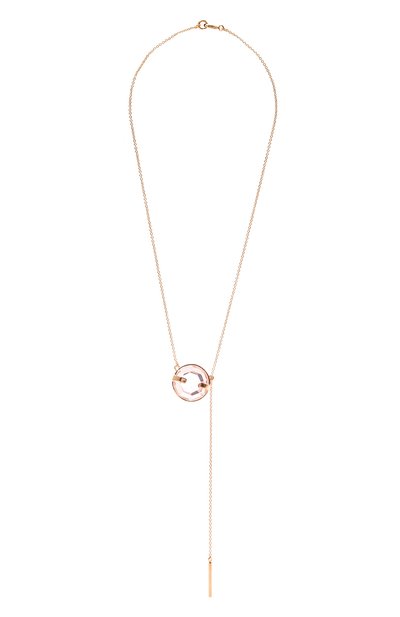 Роль акцента на этом колье отдали крупному розовому кристаллу, с которого спускается цепочка с подвеской-стержнем. Аксессуар из латуни с 14-каратным золотым покрытием застегивается шпрингельным замком.