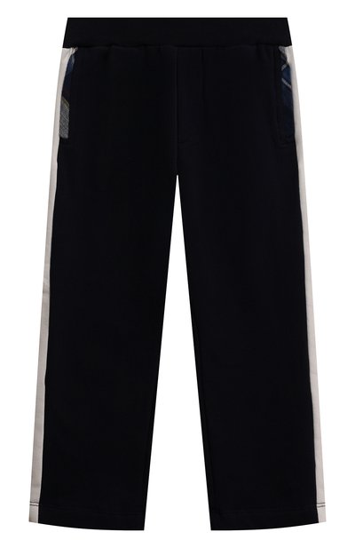 Для пошива брюк использовали футер с начесом, выполненный из хлопка с добавлением полиэстера. Модель с контрастными лампасами и брендированной нашивкой сзади дополнили эластичным поясом и двумя боковыми карманами с листочкой в клетку тартан.