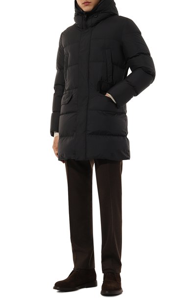 Удлиненную стеганую куртку Erico-D1 на утином пуху сшили из водоотталкивающего нейлона. Шлица сзади и штормовая планка, закрывающая молнию, застегиваются кнопками. Капюшон с вышитой литерой B и низ можно регулировать кулисками. Модель с эластичными манжетами дополнили парой внутренних карманов и тремя внешними.