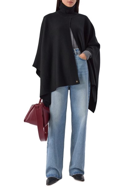 Накидку с мотивом «пье-де-пуль» выполнили из текстиля double face на основе шерсти и полиамида. Узор повторили на крупном логотипе марки, украшающем однотонную изнанку. Низ модели подчеркнули бахромой.