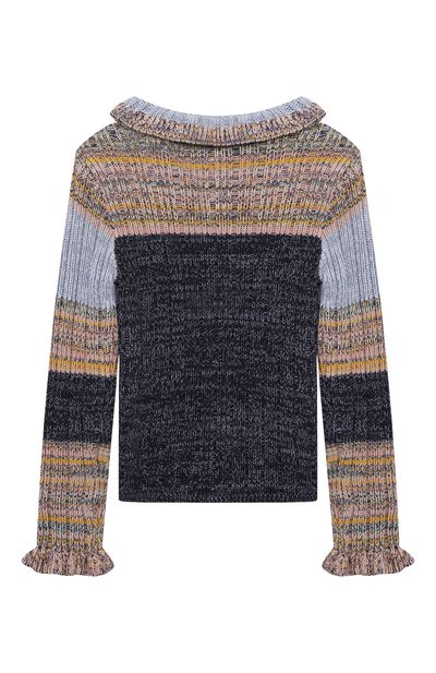 Джемпер с полосатым узором связали из хлопкового мулине с добавлением шерсти. Модель с оборками на манжетах и горловине украсили вышитой эмблемой Pegaso.