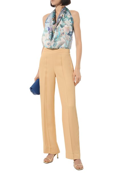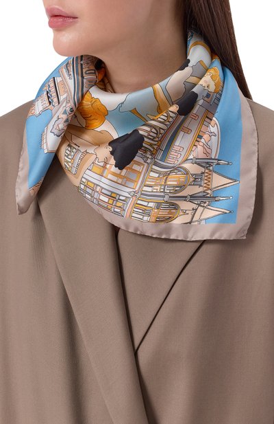 Платок «Гербарий» с подшитыми вручную краями выполнен из гладкого шелка. Аксессуар с изображением цветов и растений средней полосы России обрамлен узким лиловым кантом. В углу расположен логотип марки.