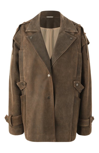 Куртку выполнили из неравномерно окрашенной кожи с искусственными потертостями. Рукава с регулируемыми патами можно полностью отстегнуть или сформировать на проймах прорези, превратив модель в кейп. Изделие с двумя накладными карманами дополнили поясом на кнопках.
