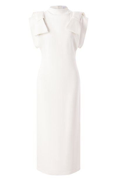Приталенное платье с высоким воротом и длинным разрезом сзади застегивается потайной молнией на спинке. Модель из вискозы украсили объемными бантами в тон на плечах.