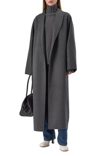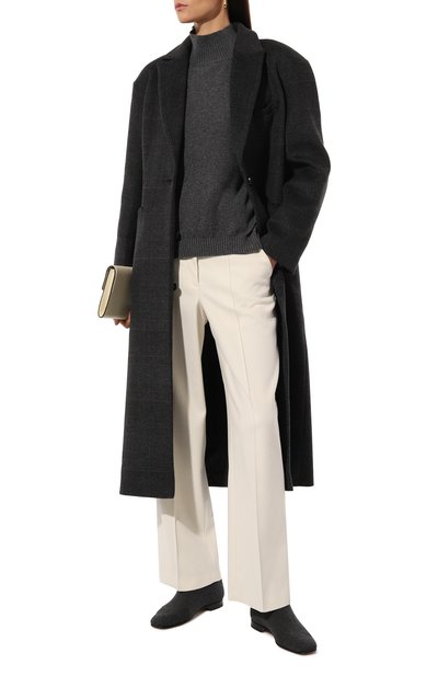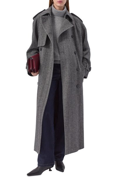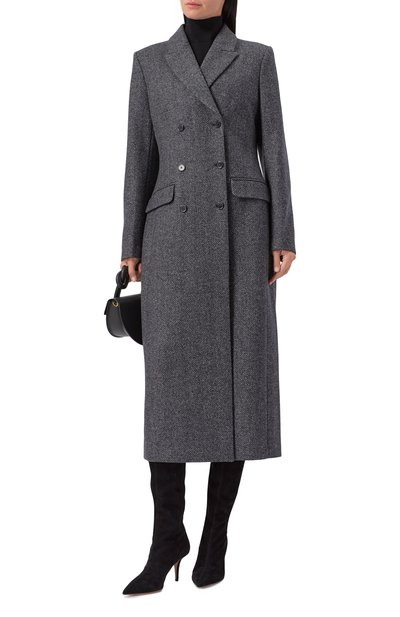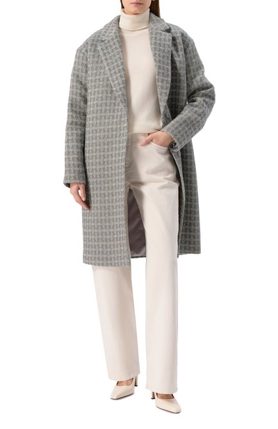 Двубортное пальто пиджачного типа выполнили из буклированного полушерстяного текстиля с добавлением мохера. Модель с заостренными лацканами, высокой шлицей сзади и тремя внешними карманами застегивается роговыми пуговицами.