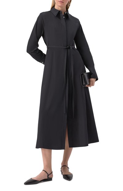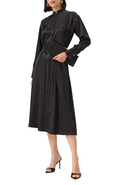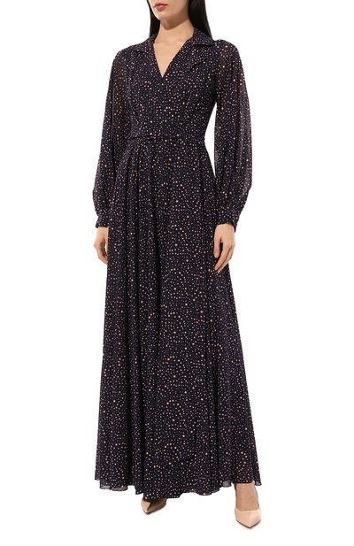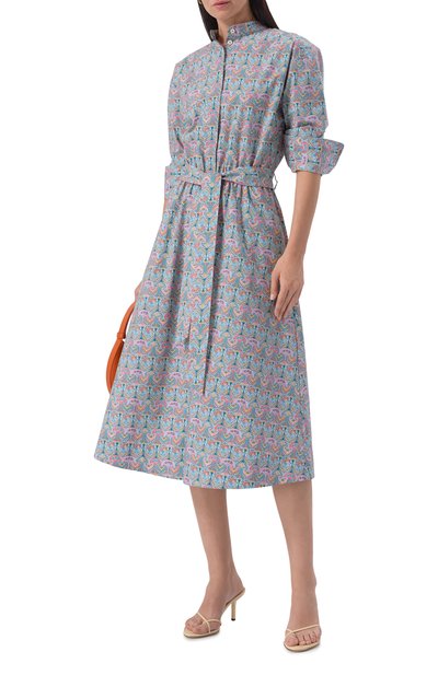 Миди-платье с английским воротником, рукавами реглан и манжетами на пуговицах сшили из шелка с авторским принтом. Модель с запахом завязывается длинным поясом сзади.