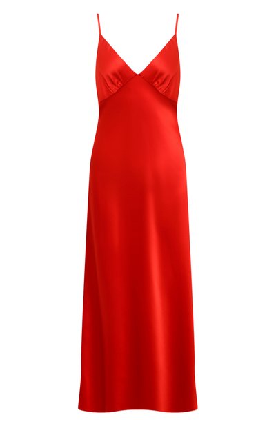 Миди-платье с полуоткрытой спиной и треугольными чашечками сшили из шелкового атласа. Модель с узкими регулируемыми бретелями одинаково хорошо сочетается и с обувью на шпильке, и с балетками.