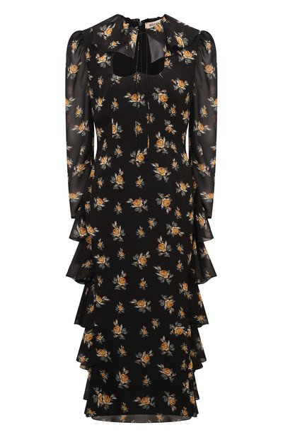 Платье Malena Roses, вдохновленное образом Моники Беллуччи в фильме «Малена», выполнили из вискозного шифона с принтом в виде роз. Для подкладки использовали хлопок. Изделие с сердцевидным вырезом, оборками и воротником с завязками застегивается сзади потайной молнией. Модель представлена эксклюзивно в ЦУМе.