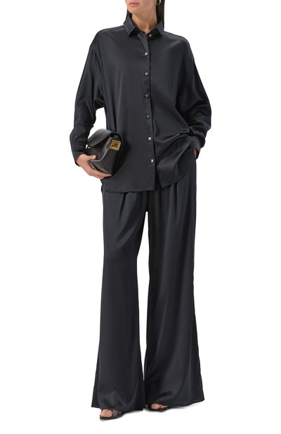 Брюки в полоску выполнили из шерсти, а для подкладки использовали микс вискозы и ацетата. Модель с защипами и стрелками дополнили поясом с эластичной вставкой сзади.