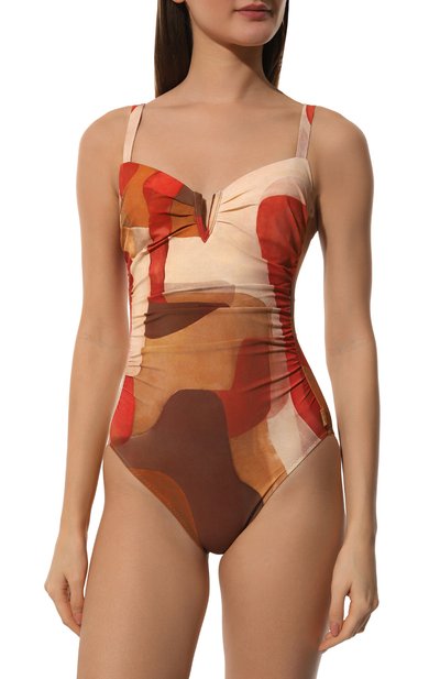 Слитный купальник с абстрактным принтом Sunset сшили из лайкры. Спереди сформировали драпировку, а сзади – глубокий круглый вырез. Регулируемые бретели подчеркнули декоративными пряжками, а боковой шов дополнили фирменной пластиной.