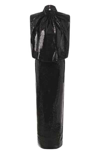 Длинное платье с короткими цельнокроеными рукавами выполнили из текстиля, плотно покрытого пайетками. Вдоль ворота на пуговицах заложили складки, а сзади на прямом подоле предусмотрели высокую шлицу.