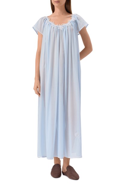 Единственным декором голубой сорочки стал рельефный простроченный орнамент, спускающийся от круглой горловины. Модель с боковыми разрезами сшили из хлопкового джерси.