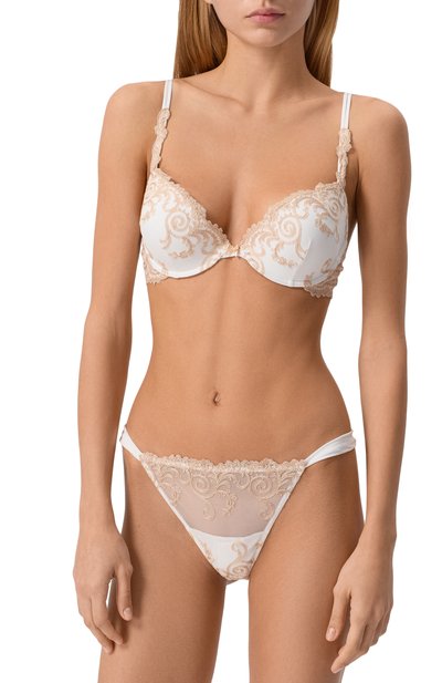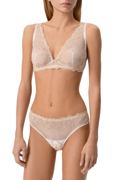 Для создания бюстгальтера с чашечками на косточках, двойными регулируемыми бретелями и двумя четырехпозиционными крючками использовали тюль с вышитым цветочным мотивом. Модель из линии Nuances D'Autunno украсили миниатюрным атласным бантом на перемычке.
