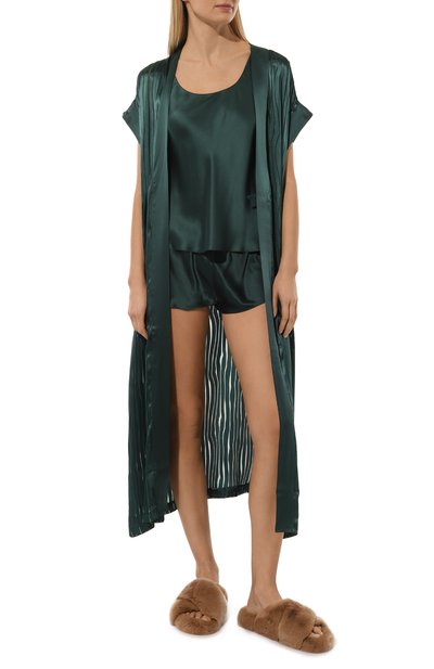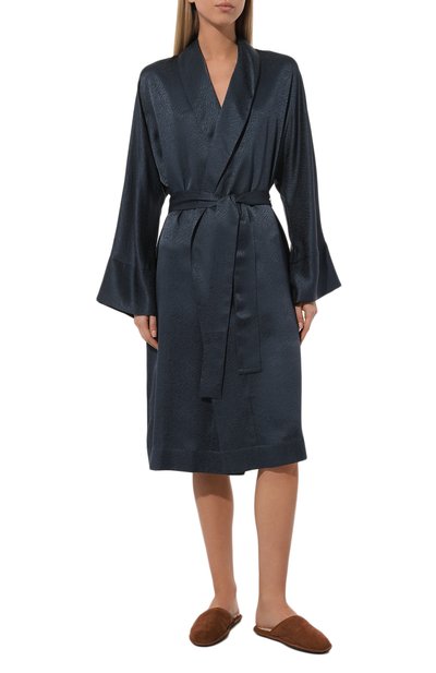 Короткий халат Tracy с потайным карманом в боковом шве сшили из блестящего шелкового атласа. Модель дополнили узким поясом-лентой, который фиксирует запах и подчеркивает талию.