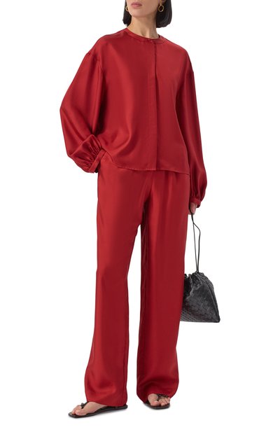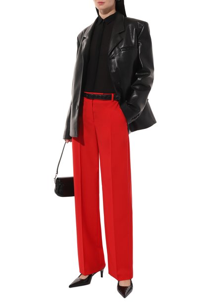 Прямые брюки со средней посадкой выполнили из шерстяной ткани с небольшим процентом эластана. Защипы изделия с боковыми карманами переходят в стрелки.
