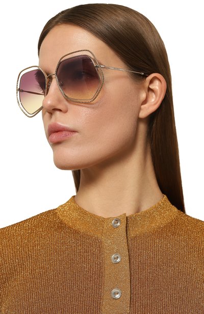Солнцезащитные очки La Mondaine изготовили из золотистого металла, заушники — из черепахового ацетата. Фигурные ободы с градиентными линзами продублировали увеличенной рамкой с рельефной отделкой.